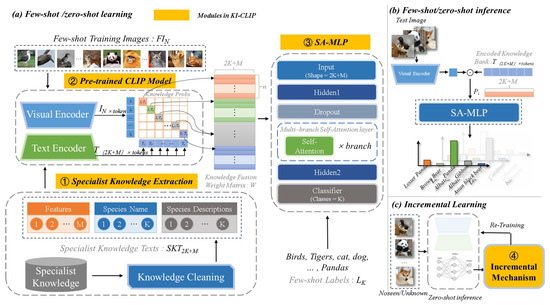 Few-shot/zero-shot learning. First, the specialist knowledge regarding the monitored endangered and rare wildlife is extracted from Wikipedia and human experts. Then, the human expert knowledge, the few image data, and annotated information about the species are used to train the KI-CLIP model with few-shot status. The prior knowledge of the fixed pre-trained CLIP (#2 module) is used to solve the training with limited data and significantly reduce the computational resources. Specifically, species that have never been photographed in the monitoring area (i.e., the unseen species) require only their expert knowledge for training, also known as zero-shot learning. As a result, the knowledge fusion weight matrix W is obtained. Next, the SA-MLP (#3 module) is trained by using W with the loss function, as in Equation (6). Therefore, the few-shot or even zero-shot learning capability of KI-CLIP is driven by expert knowledge and the CLIP model, and it is well suited to endangered and valuable wildlife with very small numbers and images. In addition, the minimal computational cost of training allows for the following incremental learning through retraining with few or even zero samples.