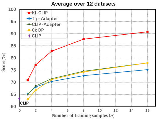The average accuracy over 12 datasets with different numbers of training samples (n). KI-CLIP shows better performance than previous baselines across different few-shot setups.