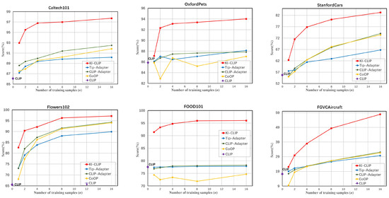 Ablation experiments were used to determine the functions of the key components in KI-CLIP and the effects of the hyperparameters. According to the results of the comparison experiments (see Section 4.2) all methods performs best on the 16-shot task. To be fair, the 16-shot task was chosen as the experimental task for the ablation experiments.