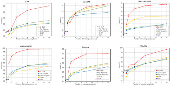 Four few-shot baseline models, namely, CLIP, CLIP-Adapter, CoOp [85], and Tip-Adapter [86], were chosen to assess the capability of KI-CLIP to identify endangered and rare wildlife. Since previous studies [31,85,86,87] have demonstrated that CLIP possesses some capability for few-shot and zero-shot learning, but that neither is adequate for practical applications, zero-CLIP was employed as the baseline. The detailed settings are presented in Table 4.