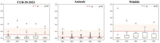 Figure 6 shows box plots of the probability statistics of the softmax classifier. Figure 6 illustrates that KI-CLIP classifies unknown species with most of the identified classification probabilities being lower than according to Equation (5), and the medians are much smaller than the confidence level (i.e., , and ). This means that the KI-CLIP method is confused about unknown species. At the same time, we can see in Figure 6 that there are a small number of outliers, indicating that the model has a relatively high confidence in classifying some unknown species. However, we can also see that these outliers are usually small, which means that we can adjust the incremental learning effect by the tolerance factor according to Equation (5). In this experiment, we eliminated more than 82.81% of the outliers by using a small tolerance coefficient (). The results suggest that the KI-CLIP method proposed in this paper can well perform incremental learning to improve the recognition accuracy of unknown species. Furthermore, the proposed KI-CLIP method can be made applicable to more diverse scenarios by simple weight adjustment.