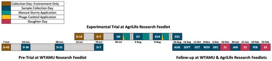 The present experiment was conducted to test the effect of two treatments applied to feedlot pen surfaces to reduce Salmonella in the feedlot environment, on beef cattle hide, within feces, and in subiliac lymph nodes. All procedures involving animals were approved by and conducted in accordance with guidelines of the West Texas A&M University Institutional Animal Care and Use Committee. Treatments were applied to the pen surface in a 2 × 2 full factorial arrangement, with an unbalanced design which included manure slurry that was applied with a dust abatement sprinkler system and a targeted bacteriophage cocktail that was applied with backpack sprayers. The study had three parts: a 36-day pre-trial that included 3 full sample collections at the West Texas A&M Research Feedlot (WTAMU Feedlot), a 21-day experimental trial that included 4 full sample collections at the joint Texas A&M AgriLife/USDA-ARS Research Feedlot (AgriLife Feedlot), and monthly follow-up samplings which occurred from September 2021 to February 2022 at both feedlots (Figure 1). The cattle feedlot locations and details of the specific study parts can be observed in Figure S1. The selection and development of the treatments occurred prior to and during the pre-trial period.