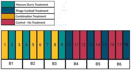 Layout of pens (1–18), blocked (B1–B6) based on the sprinkler system, at the AgriLife Feedlot. Treatments were applied in a 2 × 2 full factorial unbalanced design resulting in 4 treatment groups: (1) manure slurry (teal), (2) phage cocktail (dark blue), (3) combination (yellow), and (4) control (red). Block 1 (Pens 1 to 3) and Block 6 (Pens 16 to 18) were soil based pens and Blocks 2 to 5 (Pens 4 to 15) were fly ash based pens.