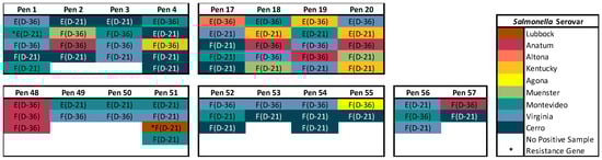 Fecal (F) and composite environment manure pack (E) isolates sequenced from Days -36 (D-36) and -21 (D-21) of the pre-trial period. The Salmonella serovars are indicated by color, and the presence of antimicrobial resistance genes are indicated by an asterisk. Pens 52 to 55 were selected for the manure slurry treatment.