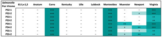 The Salmonella serovar host range of the virome from 4 WTAMU pens (P52 to P55), in duplicate (indicated by -1 or -2 after the pen number), determined by retrospective phage spot testing on the Salmonella serovars identified during the experimental trial. Results were assigned comparatively between plates ranging from the highest to lowest degrees of plaque clearing (+++, ++, +, -) which is indicated by the shading from darkest to lightest.