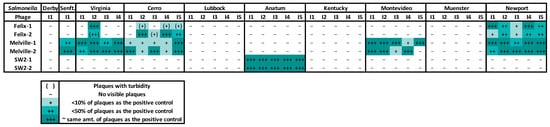 Results from routine test dilution (RTD) of selected phages on the 31 Salmonella isolates identified at the WTAMU and AgriLife feedlots. The darker shade of teal represents a higher degree (+++, ++, +) of bacterial cell clearing compared to no (-) clearing; results with turbidity (signifying partial host cell death) are signified with parentheses ( ).