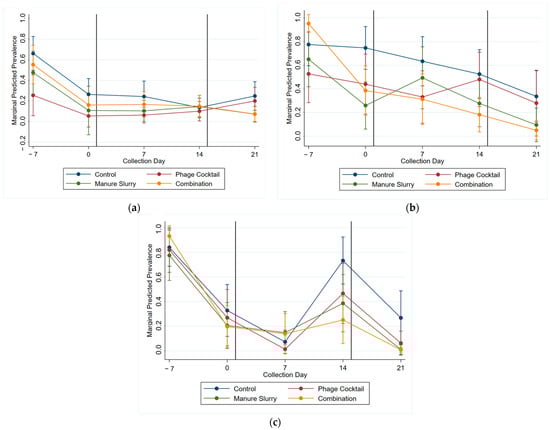 Marginal predicted Salmonella prevalence by treatment group (control—blue, manure slurry—green, phage cocktail—red, and combination—orange) and day for each cattle sample type: (a) feces, (b) brisket, and (c) rump. The vertical black line signifies the start of all treatment applications on Day 1 and the second phage cocktail treatment on Day 15.