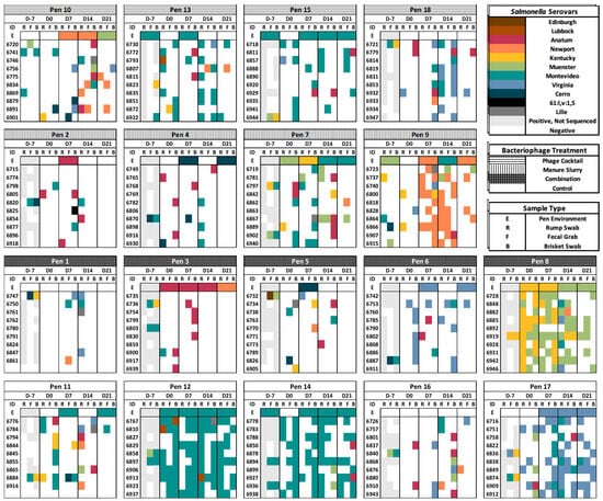 Samples (R—rump, F—feces, B—brisket, and E—composite environment manure pack) from Days -7 to 21 by feedlot pen, treatment, and cattle ID. Samples negative for the presence of Salmonella are white, samples that were positive for Salmonella but not sequenced are light gray, and the Salmonella serovars are signified by color. The pens in this graphic are arranged by treatment group, not according to the actual geographical location within the feedlot, but trends by feedlot pen can be observed in the phylogenetic tree. This figure’s design was adapted from a graphic by Levent et al. [].