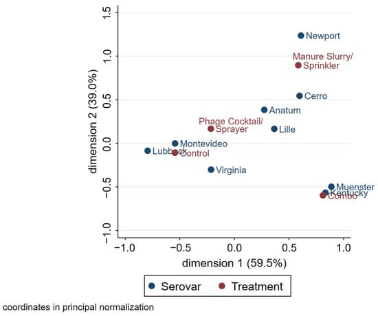 MCA plot of Salmonella serovars (blue) in relation to the treatment groups (red). Increased distance from the origin represents more distinct groups within the same variable. The angles from the origin between two different variables represent the strength of the relationship; the smaller the angle, the stronger the relationship.