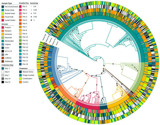 Phylogenetic tree of Salmonella isolates (n = 611). The inner ring represents the Salmonella serovars followed by the feedlot collection pen (shaded by block), treatment group, collection day (Day -7 of the pre-trial period and Days 0, 7, 14, and 21 of the study), and sample type. Bootstrap values ranging from 0.8 to 1 were included in the tree.