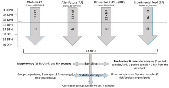 The sampling of fish was carried out on the 41st DPH after 12 h of food restriction. Fish were anesthetized using phenoxyethanol (0.4 mL × L−1). Fish were dipped onto a paper towel to remove water drops, and morphometric measurements were performed on a representative sample of 18 fish per tank. For molecular and biochemical analyses, six fish per tank were sampled and stored at −80 °C until further use. The experimental workflow is presented in Figure 1.