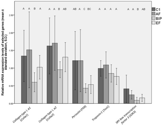 BIP-administered fish showed lower mRNA expression levels of ColIα1, ColIα2 and PSN in comparison to C1 (p = 0.009, 0.03, and 0.02, respectively) and AF (p = 0.008, 0.005, and 0.004), as well as the lower expression of ColIα1 in comparison to EF (p = 0.04) (Figure 2). On the other side, the EF group was presented with significantly lower PSN mRNA expression in comparison to the AF group (p = 0.049). Similar to skeleton differentiation marker gene expression, the level of neurogenesis marker SOX3 was lower in BIP-fed fish in comparison to both C1 (p = 0.02) and AF groups (p = 0.01).
