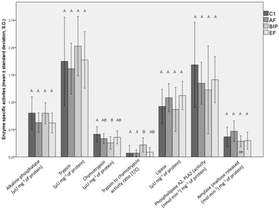 At the level of digestive enzyme-specific activities (Figure 3), differences were seen only in chymotrypsin-specific activity, with C1-fed fish having higher activity in comparison to the BIP group (p = 0.036). The trypsin-to-chymotrypsin (T/C) activity ratio was significantly higher in the BIP group in comparison to C1 (p = 0.031) and the AF group (p = 0.031).