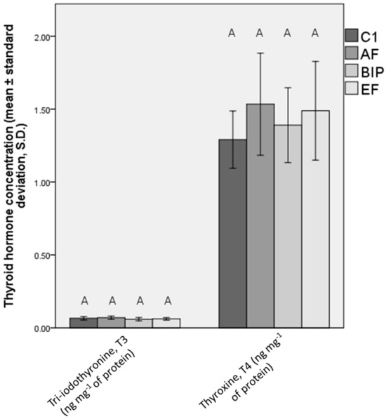 Concentrations of T3 and T4 in the whole bodies of fish fed C1, AF, BIP, and EF, provided as mean values ± standard deviations (S.D.). Letters indicate statistically significant differences between the treatments (common letters indicate no significant difference). Differences between the treatments were analyzed using the Kruskall–Wallis (KW) test. C1 = Otohime C1, AF = Aller Futura, BIP = Biomar Inicio Plus, EF = Experimental Feed.
