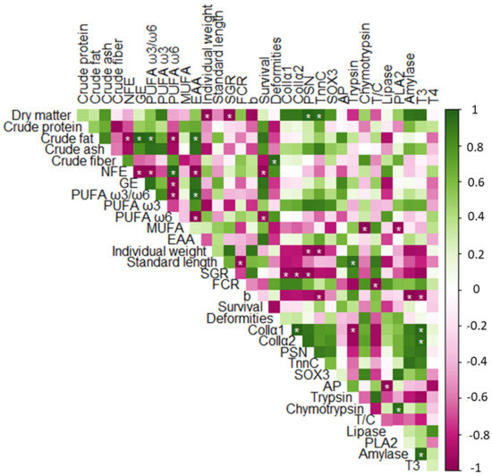 Visual representation of bivariate correlation matrix showing the association between dietary nutritive value, including dry matter percent (%), crude protein %, crude fat %, crude ash %, crude fiber %, nitrogen free extract (NFE) %, gross energy (GE, MJ × kg−1), polyunsaturated fatty acid (PUFA) ω3/ω6 ratio, PUFA ω3 %, PUFA ω6 %, monounsaturated fatty acid (MUFA) % and essential amino acid (EAA) %, and fish performance indicators, including individual weight (mg), standard length (mm), specific growth rate (SGR, % × day−1), feed conversion ratio (FCR), allometric coefficient (b), survival %, deformity %, mRNA expression level of collagen type I, α1 (ColIα1), ColIα2, periostin (PSN), troponin C (TnnC), SRY-box transcription factor 3 (SOX3), specific activities of alkaline phosphatase (AP, μU ×mg−1 of protein), trypsin (μU × mg−1 of protein), chymotrypsin (μU × mg−1 of protein), trypsin to chymotrypsin activity ratio (T/C), lipase (μU × mg−1 of protein), phospholipase (PLA2, activity (nmol ×min−1) ×mg−1 of protein) and amylase (maltose released (mmol × min−1) × mg−1 of protein), as well as the level of thyroid hormones tri-iodothyronine (T3, ng × mg−1 of protein) and thyroxine (T4, ng × mg−1 of protein). * indicates significant correlations (p < 0.05).