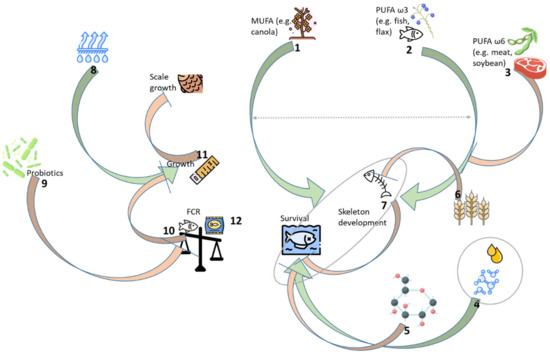 Assumed interactions among nutritive factors in the growth of post-larval largemouth bass (LMB) in the Recirculating Aquaculture System (RAS). Optimal balance between MUFA (1) and PUFA ω3 and ω6 (2, 3) in diets leads to improved skeleton growth. This MUFA/PUFA balance additionally affects fish survival, which is also influenced by feed fat content and protein quality (4), as well as the carbohydrate content of the diet (5). Skeletal development is negatively affected by the amount of dietary fiber (6), and it positively affects fish survival (7). On the other side, feed moisture percent improves fish growth rate (8), while the addition of probiotics to the diet improves FCR (9). FCR additionally affects fish growth (10). High growth rates can suppress the growth of body parts not highly relevant for survival in RAS (e.g., scales) (11); MUFA = monounsaturated fatty acids; PUFA = polyunsaturated fatty acids; and FCR = Feed Conversion Ratio. Icons used in the illustration have been downloaded from www.flaticon.com (accessed on 28 August 2023) (free license) and are used according to the Terms of Use provided at https://www.freepikcompany.com/legal#nav-flaticon (accessed on 28 August 2023). Icons were created by: Freepik, Those Icons, Darius Dan, Nortch, max.icons, DinosoftLabs, surang, rang, Nendra Wahyu and Smashicons.