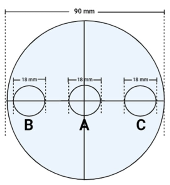 Bioassay arena used in the two-choice behavioral test for mite orientation study. One ‘treated’ pet food cube and one ‘control’ pet food cube were placed in each of the circles, B and C. Twenty adult mites of mixed sex were released into the middle circle A.