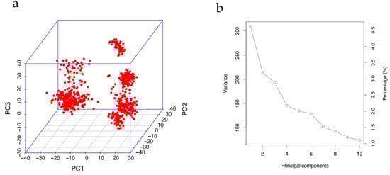 Principal component analysis. (a) Visualization of the first three PC values showing the existence of population stratification. (b) Screen plot of the first 10 PC values. Decreasing trends indicate that the first five PCs can be appropriately used to correct the population stratification.