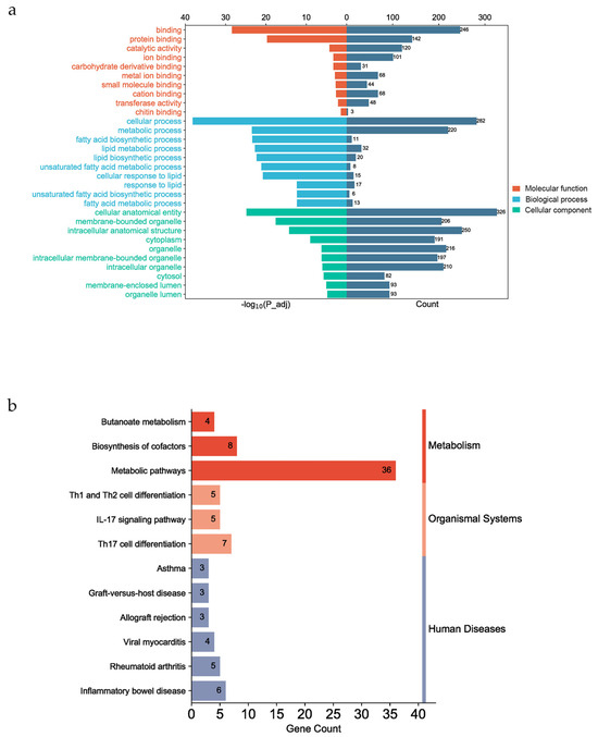 Gene functional enrichment analysis. (a) The top 10 enriched molecular functions and cellular components and 10 biological processes associated with fatty acid and lipid metabolism. (b) The 12 enriched KEGG pathways, which can be divided into three categories on the KEGG website (Metabolism, Organismal Systems, and Human Diseases).
