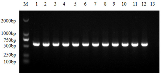 16S rRNA detection of partial E. coli isolate strains. M, DL2000DNA Marker; 1, ATCC25922; 2–12, partial E. coli isolate strains; 13, negative control.