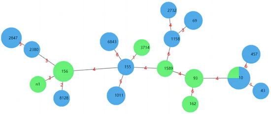 Cluster analysis was performed by geoBURST software v1.1.5. The black number represents ST types; The red number represents the difference in allele numbers between different ST types.