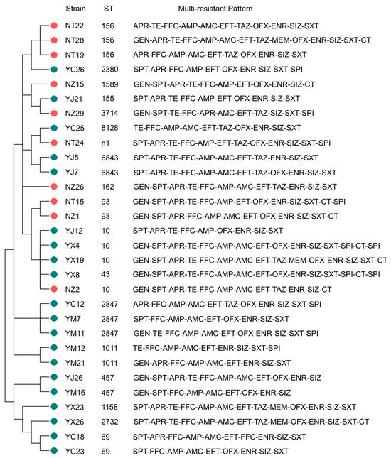 Distribution of the ST type of the 30 isolates and multidrug resistance profile.