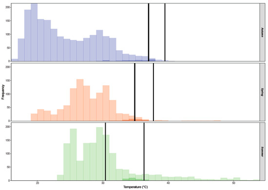 Frequency of field body temperatures (Tb, dark colors) and operative temperatures (Te, light colors) in autumn (blue), spring (orange), and summer (green). Vertical black solid lines indicate the set-point range temperatures (Tset).