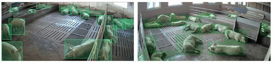 17] have developed an enhanced pig detection algorithm based on an adaptive GMM. In this method, the Gaussian distribution is scanned periodically—typically once every m frames—in order to adapt the model. Redundant Gaussian distributions are detected and eliminated to enhance the convergence speed of the model. However, it is important to note that this method may face challenges in detecting pigs when sudden lighting changes occur. Traditional computer vision technology has the potential to improve animal welfare and achieve high recognition accuracy; however, it may not be suitable for industrial production requirements due to its slow detection speed. Additionally, the performance of the model may notably drop when the pigs are occluded or when there is significant variation in the size of the target pigs in the image.
