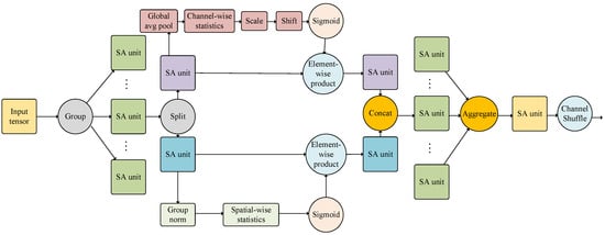 27] is an attention mechanism that integrates group convolutions, spatial attention mechanisms, channel attention mechanisms, and the concepts of ShuffleNet. By introducing channel shuffle operations and block-wise parallel usage of spatial and channel attention mechanisms, shuffle attention achieves an efficient and tight integration of the two attention mechanisms while also possessing the characteristics of a low computational cost and plug-and-play capability. This means that shuffle attention can be quickly and seamlessly integrated into any CNN architecture for training while ignoring computational cost overheads.