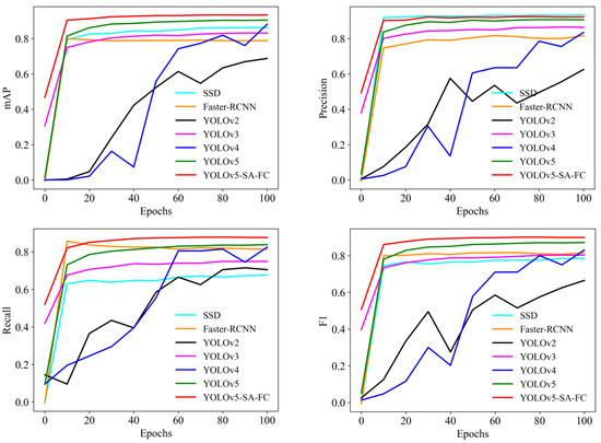 Figure 11 showcases the comparison results of different models at various iterations. The curves representing mAP, precision, recall, and F1 scores show YOLOv5-SA-FC consistently outperforms those of other models. This clearly indicates that YOLOv5-SA-FC exhibits a superior performance across all metrics when compared to the other models. These results serve as strong validation for the effectiveness of YOLOv5-SA-FC throughout the entire training phase.