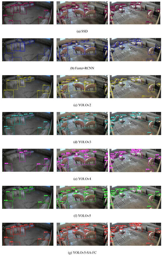 Table 6, it can be seen that our YOLOv5-SA performs the best. The shuffle attention uses dual-channel fusion technology and a channel shuffling operation, making the model more sensitive to capturing target features, which enables the model to adaptively extract valuable information in critical areas of the image, reduce irrelevant interference (such as overlapping pigs), and improve accuracy. Moreover, the YOLOv5-SA-FC model achieved the best performance in all comparisons, further demonstrating the superiority of our proposed model. By leveraging the shuffle attention module, our model could dynamically focus on the most relevant features for pig detection and counting while reducing the weights of non-essential features. Additionally, the Focal-CIoU loss mechanism gave a higher priority to predicted boxes having higher overlap with the target box, thus significantly improving the detection performance.