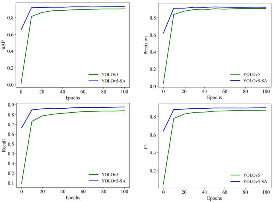Figure 9 illustrates the results obtained by the different models at various iterations. The curves representing the mAP, precision, recall, and F1 score for YOLOv5-SA consistently outperformed those of YOLOv5, indicating that YOLOv5-SA had a superior performance in terms of mAP, precision, recall, and F1 score, when compared to YOLOv5. These results validate the effectiveness of the shuffle attention module throughout the entire training phase.