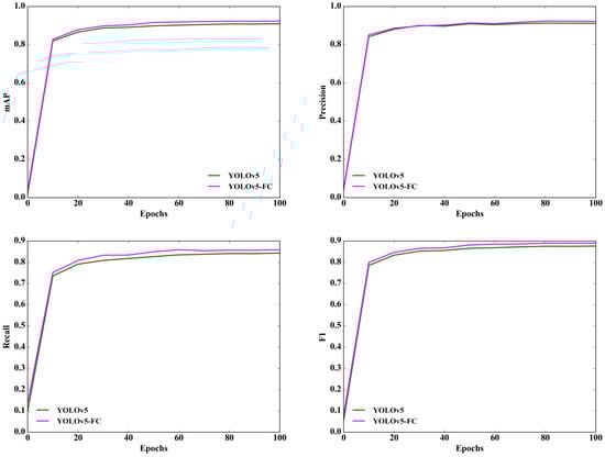 Figure 10 presents the comparison results of different models at various iterations. The curves depicting mAP, precision, recall, and F1 scores consistently outperform for YOLOv5-FC in comparison to YOLOv5. This clearly indicates that YOLOv5-FC exhibits a superior performance across mAP, precision, recall, and F1 score metrics when compared to YOLOv5. These results serve as validation for the effectiveness of the Focal-CIoU loss throughout the entire training phase.