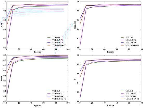 To confirm the superiority of our proposed YOLOv5-SA-FC model, we carried out a comparison with the other models mentioned above, including YOLOv5, YOLOv5-SA, and YOLOv5-FC, against YOLOv5-SA-FC, which combines the shuffle attention and Focal-CIoU modules into the YOLOv5 structure. The results are presented in