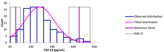 In the whiskers diagram, 50% of the reference individuals were distributed between 224.0 and 404.3 pg/mL regarding the FGF-23 concentrations (Figure 2).