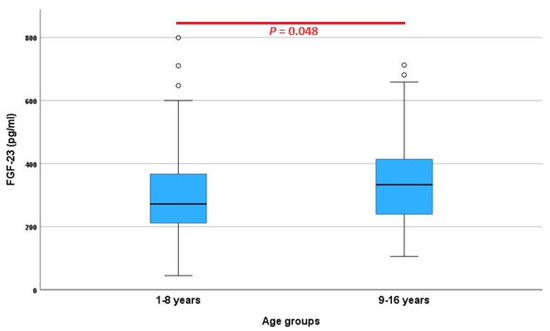 The results for the FGF-23 concentration were available for all 136 dogs (mean 304.2 pg/mL, median 297.8 pg/mL, standard deviation 118.6 pg/mL, minimum 44.63 pg/mL, and maximum 799.1 pg/mL), and the data were normally distributed (p = 0.054). In the non-parametric analysis, the lower limit of the reference interval was 95.8 pg/mL [90% CI: 44.6; 139.2] and the upper limit 695.1 pg/mL [90% CI: 598.7; 799.1] (Figure 1). In dogs of <9 years of age (68/140, 48.6%), the reference interval was calculated using robust methods and ranged from 83.5 pg/mL [66.4; 105.7] to 709.6 pg/mL [596.3; 839.0], while in dogs of ≥9 years of age (72/140, 51.4%), it ranged from 128.8 pg/mL [108.6; 154.8] to 635.0 pg/mL [572.5; 693.7]. Statistically significant differences in the FGF-23 concentrations between both age categories were demonstrated (χ2 = 3.897, df = 1, p = 0.048) (Figure 3).