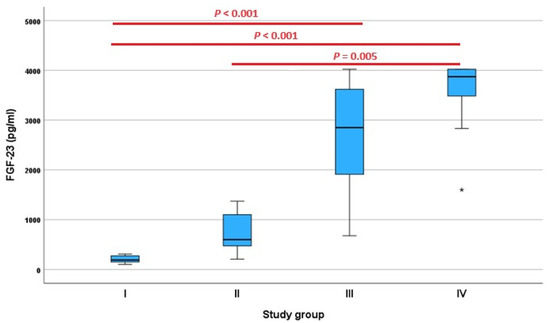 Fibroblast growth factor (FGF)-23 concentration as measured via the FGF-23 ELISA Kit (Kainos Laboratories, Tokyo, Japan) in 40 dogs divided into study groups I, II, III, and IV (n = 10 each) based on creatinine concentration according to the guidelines of the International Renal Interest Society (IRIS). * = extreme outliers (values that are more than 3.0 × interquartile range below Q1 or above Q3 in the boxplot).