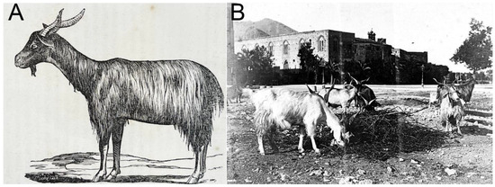 (A) Figure taken from “Riproduzione, Allevamento e Miglioramento degli Animali Domestici in Sicilia” by Chicoli (1870), representing a specimen of the so-called Capra Comune di Sicilia. (B) A historical photo of some subjects of this breed (Piazza Francesco Crispi, Palermo, 1927): it was common to see goats roaming the streets of the Sicilian cities, where a local traditional practice involved the “capraru” (goat breeder) delivering fresh milk at dawn by milking the goats right at people’s doorsteps.