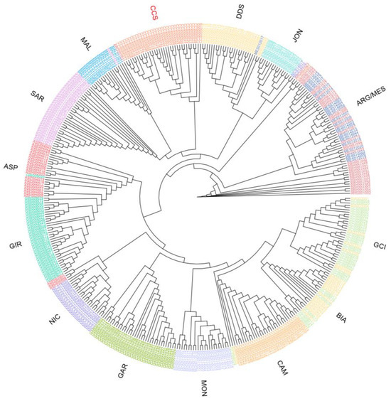 The results of the phylogenetic tree analysis based on Reynold distances (Figure S1) are consistent with the MDS analysis, with the central Italian breeds (BIA, GCI, GAR, and MON) clustering together. The CCS is closely related to ASP and GIR, which are also reared in close proximity. In addition, the tree is based on identity-by-state (IBS), and including all individual subjects (Figure 4) clearly showed that all CCS animals clustered together and were easily distinguishable from other populations. Specifically, the CCS breed was closely related to other Sicilian breeds. Notably, the only non-distinguishable pairs were MES and ARG, and BIA and GCI.