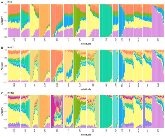 Admixture models using a number of clusters (K) equal to 7 (A), 11 (B), and 13 (C). The best-fitting model was found to be the one with K = 11. Each color represents a different cluster and each bar a different subject. Sicilian breeds: ARG—Argentata dell’Etna, CCS—Comune di sicilia, DDS—Derivata di Siria, GIR—Girgentana, MES—Messinese. Other Italian breeds: ASP—Aspromontana, BIA—Bianca Monticellana, CAM—Camosciata delle Alpi, GAR—Garganica, GCI—Gricia Ciociara, JON—Jonica, MAL—Maltese, MON—Capra di Montefalcone, NIC—Nicastrese, and SAR—Sarda.