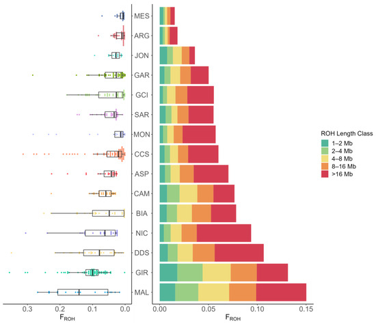 Boxplot of the total ROH-based inbreeding coefficient (FROH) and barplot of FROH by ROH length by breed. Sicilian breeds: ARG—Argentata dell’Etna, CCS—Comune di sicilia, DDS—Derivata di Siria, GIR—Girgentana, MES—Messinese. Other Italian breeds: ASP—Aspromontana, BIA—Bianca Monticellana, CAM—Camosciata delle Alpi, GAR—Garganica, GCI—Gricia Ciociara, JON—Jonica, MAL—Maltese, MON—Capra di Montefalcone, NIC—Nicastrese, and SAR—Sarda.