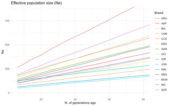 Genomic effective population size (Ne) trends. Sicilian breeds: ARG—Argentata dell’Etna, CCS—Comune di sicilia, DDS—Derivata di Siria, GIR—Girgentana, MES—Messinese. Other Italian breeds: ASP—Aspromontana, BIA—Bianca Monticellana, CAM—Camosciata delle Alpi, GAR—Garganica, GCI—Gricia Ciociara, JON—Jonica, MAL—Maltese, MON—Capra di Montefalcone, NIC—Nicastrese, and SAR—Sarda.