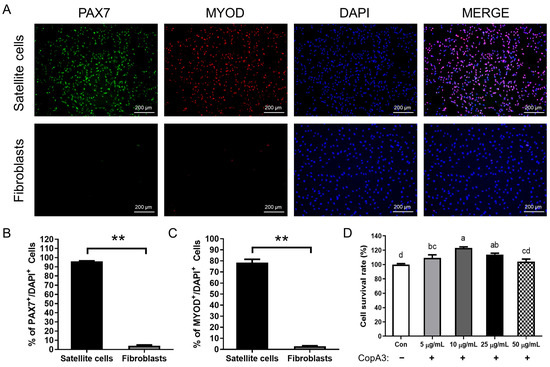 We conducted immunocytochemistry to confirm the presence of satellite cells (Figure 1A). PAX7 has been recognized as a specific marker in PMSCs [22,23], and MYOD is classified as one of the myogenic regulatory factors that can co-express with PAX7 [23,24]. The percentage of PAX7+/DAPI+ cells was 95.9 ± 0.7% in PMSCs, whereas it was 4.2 ± 0.7% in fibroblasts (p < 0.01) (Figure 1B). In addition, the percentage of MYOD-positive cells was significantly higher (p < 0.01) in PMSCs than in fibroblasts (Figure 1C). We measured the cytotoxicity of various concentrations of CopA3 on PMSCs (Figure 1). Cell survival rate was significantly higher with 10 µg/mL of CopA3 than with the other doses. However, the survival rate decreased in a dose-dependent manner at 25 and 50 µg/mL. Based on this result, we selected 10 µg/mL of CopA3 for subsequent analysis.
