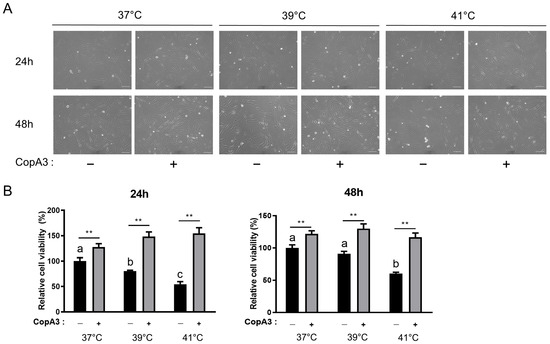We determined the effect of CopA3 on the viability of PMSCs under heat stress. No morphological changes were observed in PMSCs at different temperatures and CopA3 treatment (Figure 2A). However, as the incubation temperature increased, cell viability significantly decreased (p < 0.01) in CopA3-untreated groups (Figure 2B). Interestingly, CopA3 treatment significantly improved the cell viability compared to that of the control (37 °C, CopA3(−)) group at all temperatures (p < 0.01; Figure 2B).