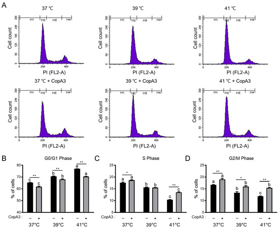 To examine the effect of CopA3 on the PMSC cell cycle, we analyzed the cell cycle distribution at 37, 39, and 41 °C (Figure 3). The proportion of cells in the G0/G1 phase increased with increasing temperature (p < 0.01) (Figure 3A,B). However, CopA3 significantly reduced (p < 0.01) the proportion of cells in the G0/G1 phase at all temperatures (Figure 3A,B). The proportion of cells in the S and G2/M phases also decreased with increasing temperature; however, CopA3 effectively reversed this decreased effect (Figure 3A,C,D).