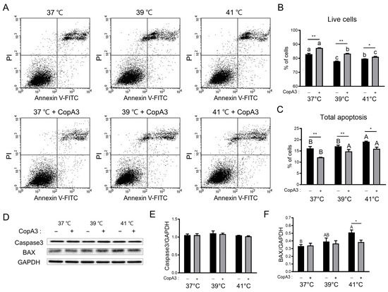 The addition of CopA3 decreases cell apoptosis at all temperatures. (A) Dot plot of apoptosis analysis via flow cytometry. (B) Percentages of live cells and (C) total apoptosis. (D) Comparison of apoptosis-related protein bands with or without CopA3 treatment at different temperatures (37, 39, and 41 °C). (E,F) Protein expression levels were normalized using glyceraldehyde 3-phosphate dehydrogenase (GAPDH) levels. Data are represented as the mean ± SE. n = 3. The Duncan multiple-range test was used to compare temperature-related differences within groups treated with 10 µg/mL of CopA3(+) and CopA3(–) groups, respectively. a–c Different letters denote statistically significant differences among the groups (p < 0.01) in Duncan multiple rage test. A–B Different letters indicate the statistically significant differences among treatment groups (p < 0.05) in the Duncan multiple-range test. Student’s t-test was employed to assess significant differences between the two groups treated with 10 µg/mL of CopA3(+) and CopA3(–) groups at the same temperature. ** p < 0.01 and * p < 0.05.