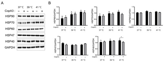 Heat shock protein (HSP) expression levels with or without CopA3 treatment at different temperatures. (A) Comparison of HSP bands using Western blotting. (B) HSP expression levels were normalized using GAPDH levels. n = 3. Values are represented as the mean ± SE. The Duncan multiple-range test was used to compare temperature-related differences within groups treated with 10 µg/mL of CopA3(+) and CopA3(–) groups, respectively. a–b Different letters denote statistically significant differences among the groups (p < 0.01) in the Duncan multiple-range test. A–C Different letters indicate the statistically significant differences among treatment groups (p < 0.05) in the Duncan multiple-range test. Student’s t-test was employed to assess significant differences between the two groups treated with 10 µg/mL of CopA3(+) and CopA3(–) groups at the same temperature. * p < 0.05.