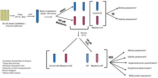 One straw (from a single ejaculate) from each bull was thawed by immersion in a 37 °C water bath for 40 s for each experiment. The six samples (one from each bull) were pooled together into a sterile plastic tube (CellstarTubes, Greiner Bio One, Frickenhausen, Germany), washed twice with 3 × volumes of Sperm TALP and centrifuged at 200× g for 10 min at room temperature (RT). Sperm concentration was determined by cell count on a Neubauer chamber (OptikLabor, Grale HDS, New South Wales, Australia). Finally, cells were re-suspended in Sperm TALP to a final concentration of 50 × 106 spermatozoa/mL and the sample was divided into six groups (Figure 1), with a total volume of 100 μL each. In four groups, only DMSO (vehicle) was added, while the other two were supplemented with 100 μM melatonin. One DMSO sample (Control-t0) and one melatonin sample (Melatonin-t0) were analyzed immediately. The other four samples were incubated in a 37 °C water bath for 60 min. At the end of the incubation (t60), 100 μΜ H2O2 was added to one of the DMSO groups (HP) and to one of the melatonin groups (Melatonin-HP) and all four groups were analyzed as described below. Therefore, in each experiment there were 6 samples to be analyzed: Control-t0, Control-t60, HP, Melatonin-t0, Melatonin-t60 and Melatonin-HP, where HP is hydrogen peroxide (100 μM H2O2). A total of six samples were analyzed in every experiment.