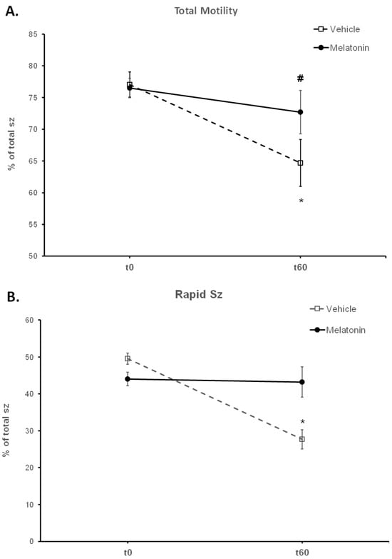 The effect of melatonin on the motility of spermatozoa (sz). Frozen–thawed spermatozoa were incubated at 37 °C for 60 min in the presence of DMSO (Vehicle) or 100 μM melatonin (Melatonin). The percentage of motile spermatozoa (A) and the percentage of spermatozoa with rapid motility (B) were determined by CASA and the results are presented as mean values (% of total spermatozoa) ± SEM. The asterisk (*) indicates statistically significant difference between Control-t0 and Control-t60 (p < 0.01, n = 6), whereas the hashtag (#) indicates the tendency of melatonin to increase the percentage of total motile spermatozoa compared to the control group, at t60.