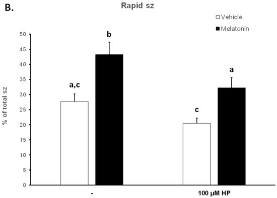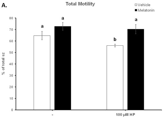 The effect of melatonin on the percentage of total motility (A) and rapid spermatozoa (B) after exposure to 100 μΜ H2O2. Cells were incubated at 37 °C in the presence of DMSO (vehicle, white bars) or 100 μΜ melatonin (black bars) for 60 min, at which point the indicated samples were exposed to 100 μΜ hydrogen peroxide (HP). The percentages of spermatozoa (sz) with total (A) or rapid (B) motility were determined by CASA. Results are presented as mean values (% of total spermatozoa) ± SEM and different letters indicate statistically significant differences (p < 0.05, n = 6).